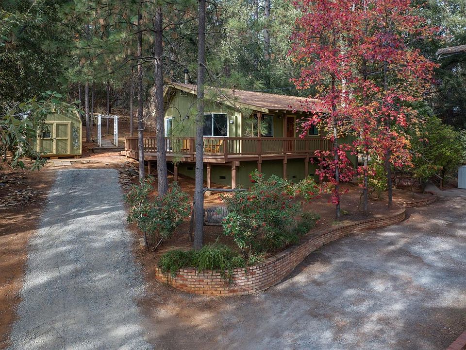 You will be utterly charmed by this adorable cottage in the woods. The one acre setting offers a wonderful combination of oaks and evergreens at the ideal 2800' elevation. A mere 12 minute drive from main street Murphys, you will feel that you have truly escaped to the country. With 2 bedrooms, 1.25 baths, the home is surrounded by winding paths and lovely decks from which to contemplate the lovely surroundings. The house has been completely remodeled floor to ceiling - no detail was overlooked! New comp roof, 2022. Flooring is new luxury vinyl, fresh paint inside and out, and 3 brand new mini splits provide zoned heat and air in each living area. Kitchen counters are solid surface with tile back splash, appliances are all new, including dishwasher addition and beautiful new fridge. Some new windows, esp. oversized slider with internal blinds. Deck was completely redone and stained. Beautiful deck and yard setting with 2 sheds, and ramp from parking area for wheelchair access. You really must see this adorable (and affordable!) cabin to appreciate it, no detail was overlooked.