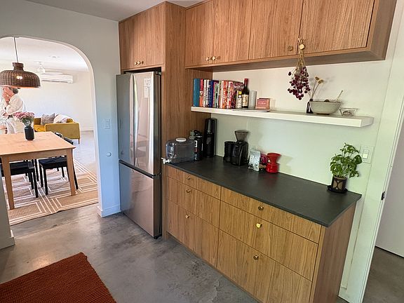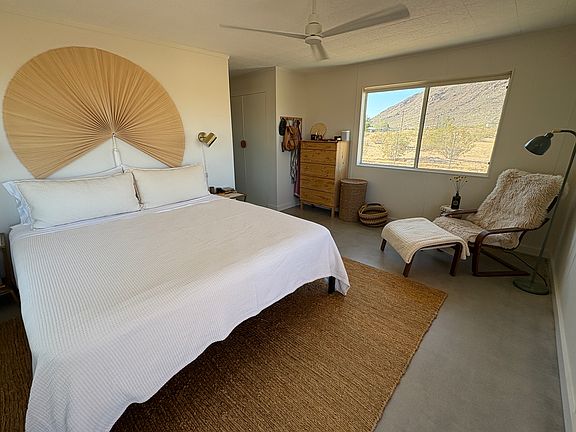 The home has been beautifully designed with a modern kitchen and gas stove, freestanding bathtub in the primary bedroom, polished concrete floors and all new windows and doors to take advantage of the gorgeous desert views. Minisplits provide ample heating and cooling, the cowboy tub surrounded by a wood deck is the perfect little pool for summer and the shaded back patio is great for relaxing and outdoor dining. There's a wood burning stove in the living room for cozy cool nights and a outdoor firepit area for warm summer nights under the stars.