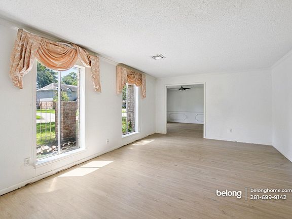 Warm architectural details and a practical layout define this 4-bedroom, 2.5-bath home nestled in a peaceful and well-lit neighborhood. The spacious living room makes an immediate impression with its exposed ceiling beams, wood-paneled walls, and a brick fireplace that anchors the space with charm. Large windows frame views of the fenced backyard, while a built-in shelving and cabinetry unit adds both character and function.