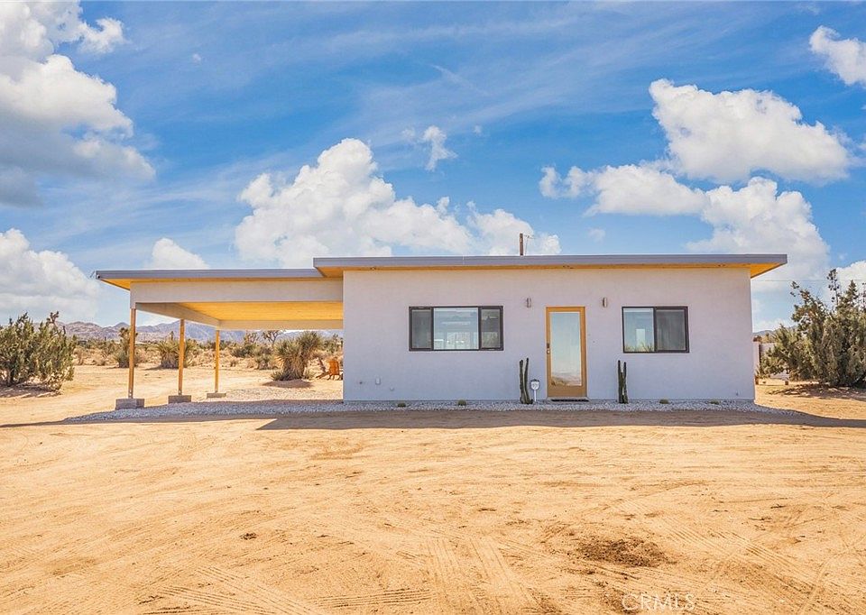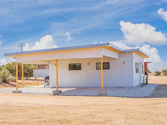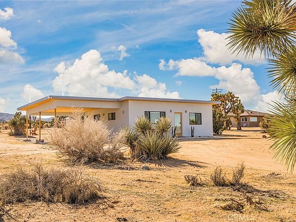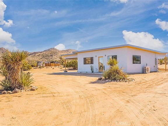 Quintessential Desert Star: Complete Rebuild – Stripped to Studs, Fully Remodeled, Fully Permitted, New Plumbing, New Electrical, New Roof, Polished Concrete Floors, New Sheetrock, New Stucco, ALL NEW SURFACES and APPLIANCES. Combined with careful craftsmanship and high-end design details, you'll find why this home makes for a great vacation rental or cozy primary residence. Picturesque views of the desert mountains and protected Joshua Trees out of every window! True beauty lies in the acre of land the home sits on. The natural desert landscape is left for those who appreciate its natural state and for its new owners to explore and feel the tranquillity of this special place on earth. This supreme location offers seclusion but not total isolation.