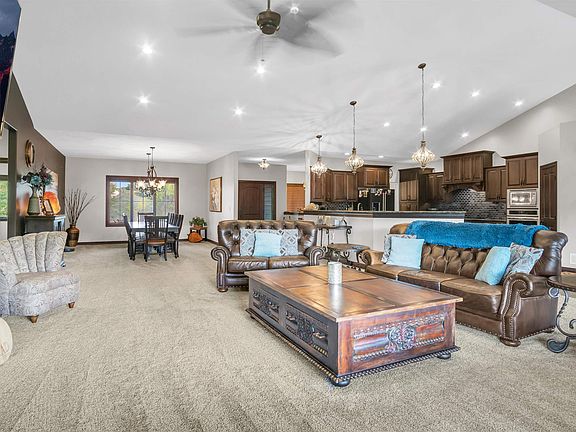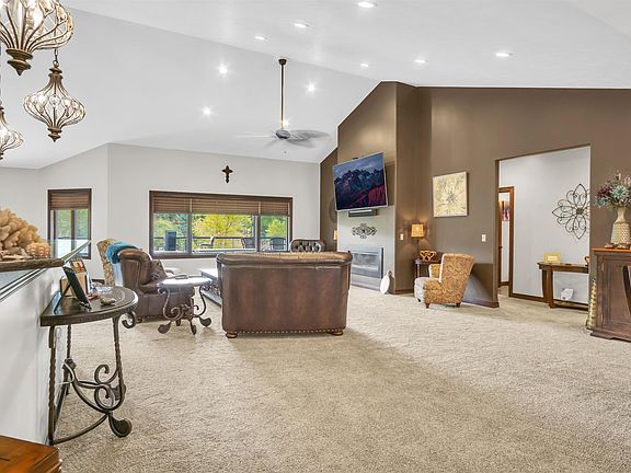 Located northwest of Kearney, this breathtaking acreage offers over 4 acres of serene, landscaped beauty that feels like a private mountain escape. Built in 2015, this exceptional home boasts over 7,800 sq. ft. of living space with 8 bedrooms, 5 bathrooms, and a 4-car attached garage. The main level features a bright, open-concept layout with vaulted ceilings, abundant natural light, and a cozy gas fireplace. The kitchen, dining, and living areas flow seamlessly for easy entertaining. The luxurious primary suite offers dual walk-in closets, a soaking tub, and a spacious walk-in shower. Two laundry rooms add convenience for a busy household. The fully finished lower level is designed for entertainment, featuring theatre hookups, a second kitchen, 5 spacious bedrooms, 2 bathrooms, and walkout access to a covered patio. Step outside to enjoy the show-stopping 200-foot waterfall that cascades into a lazy river connecting to a 1-acre pond, stocked with trout, crappie, largemouth bass, and bluegill. The pond is 18 feet deep in the center—perfect for swimming, kayaking, or relaxing on the white sandy beach. The home’s exterior has been freshly painted with top-of-the-line Sherwin-Williams paint over durable Hardie Board siding—offering both quality and longevity for years to come. The grounds are meticulously maintained and irrigated with three separate sprinkler systems, covering an acre of lawn plus the front and back landscaping. Two wells, two water furnaces, and two on-demand water heaters provide efficiency and comfort. A large storm shelter adds peace of mind. This one-of-a-kind property must be seen to be fully appreciated—schedule your private showing today and experience your own slice of paradise just minutes from town!