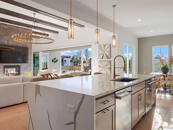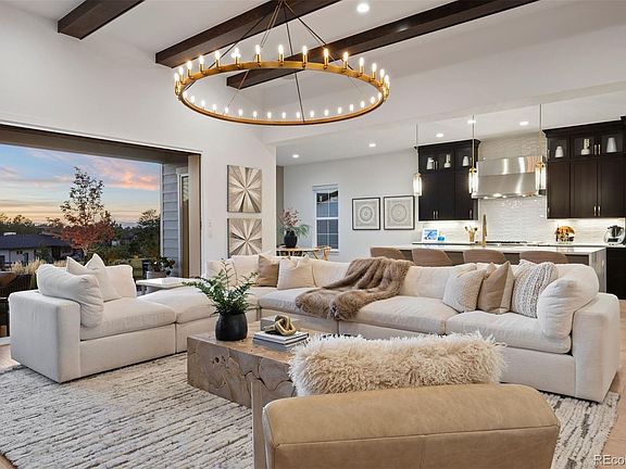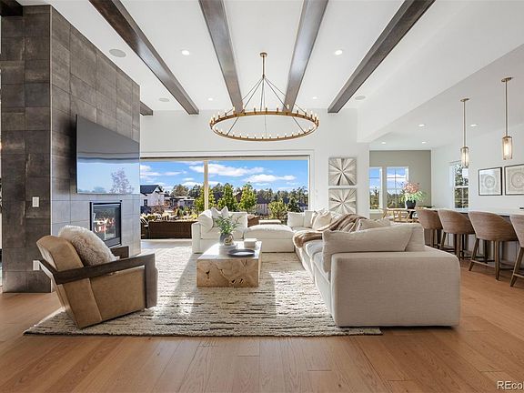 Nestled on a premier private homesite in the coveted Timbers at the Pinery, this exceptional ranch-style home offers refined Colorado living at its finest. Featuring four bedrooms and five bathrooms, the residence is filled with natural light, soaring ceilings, and exquisite craftsmanship throughout. The welcoming entry opens to 12-foot beamed ceilings and an open floor plan that seamlessly connects the dining area, custom two-sided fireplace, and spacious living room. Expansive 24-foot stacked sliding patio doors create effortless indoor-outdoor living. The gourmet kitchen overlooks the living space and showcases a 10-foot waterfall island, custom cabinetry to the ceiling, four ovens, a 48-inch professional range, built-in 42-inch refrigerator, designated eating area and a large walk-in pantry. The backyard is a private entertainer’s retreat with an expansive patio, stunning western sunset and mountain views, built-in fire pit, hot tub, built in grill and wet bar area, and ample grassy space. Inside, Restoration Hardware lighting, 8-inch white oak floors, and timeless finishes reflect thoughtful attention to detail. The main-floor primary suite overlooks the backyard and features a spa-like five-piece bath and custom walk-in closet. Two additional ensuite bedrooms, a main-floor office with glass French doors, and a functional mudroom and laundry complete the main level. The remodeled lower level is designed for entertaining with a large recreation room, game room, fully equipped wet bar, surround sound, and Control4 system throughout the home and outdoor spaces. A guest bedroom, exercise room or optional fifth bedroom, and generous storage complete the lower level. Residents of the Timbers have the option to join the Pinery Country Club or the Golf Club at Pradera, offering world-class golf, fitness, swimming, and social amenities. This is more than a home—it’s a true reflection of the Colorado lifestyle.