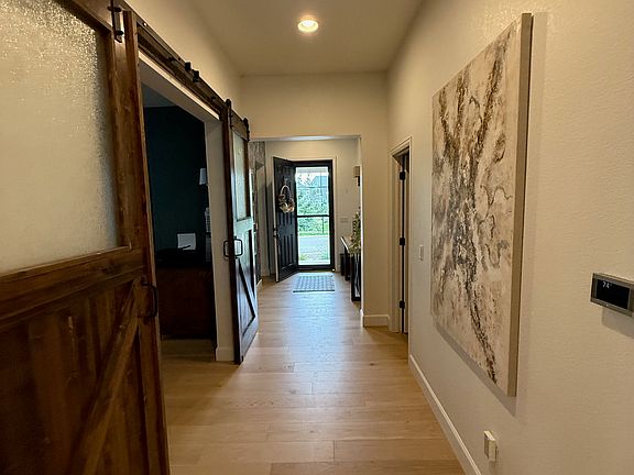 This home offers an open floor plan with hardwood flooring, a gas fireplace, and a modern kitchen with quartz countertops and stainless steel appliances. A main-level office with barn doors provides the perfect work-from-home setup.