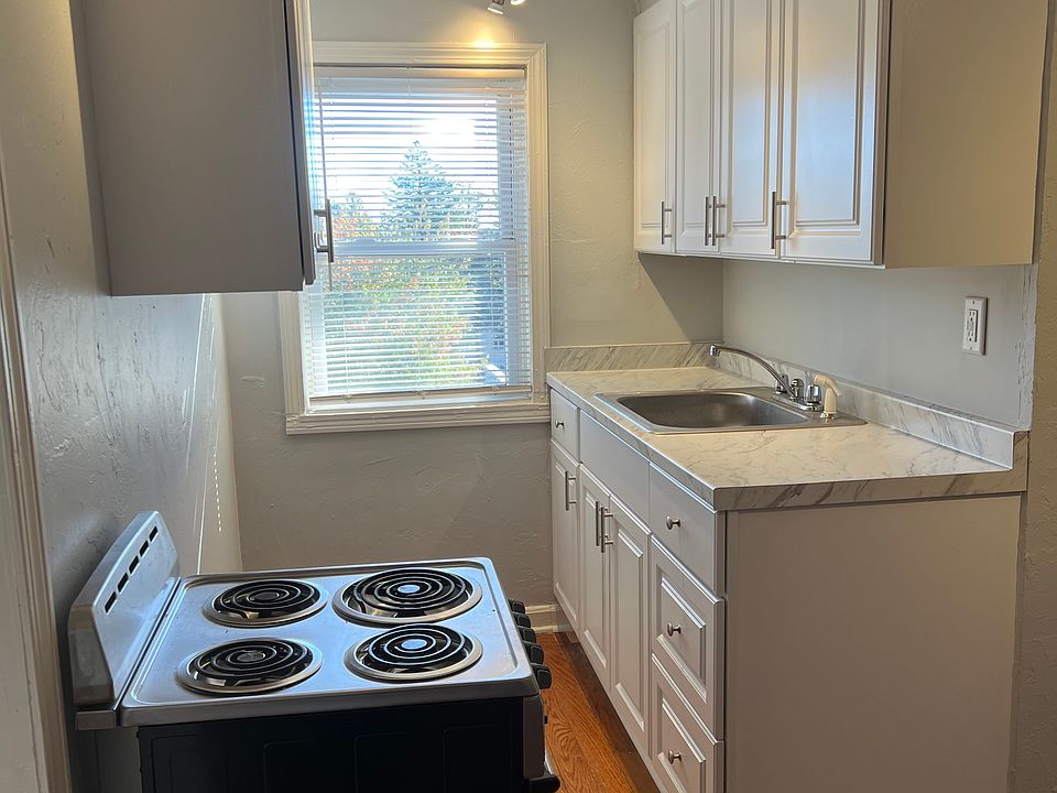 New kitchenNewly painted studio apartmentHardwood floorsLarge closet spaceOff-street parking