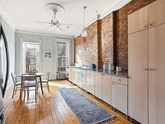 The parlor level offers an oversized living room that walks into a stylish and sunny kitchen boasting rustic exposed brick, plank wood floors and plenty of room for dining. The kitchen steps out onto a deck that leads down to the garden via a spiral staircase. The parlor level also offers an oversized full bathroom featuring a claw-foot tub. Upstairs, you'll find two spacious bedrooms and another full bathroom with a walk-in shower.