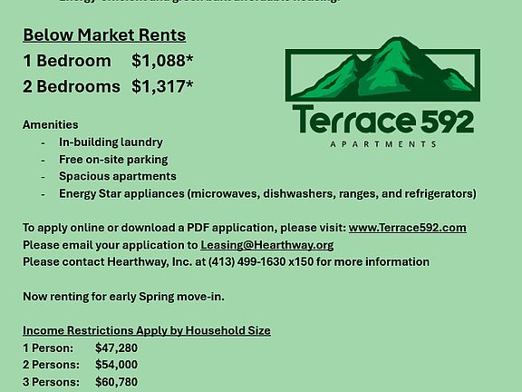 - 41 brand new 1 and 2 bedroom apartments for rent. - Located in the heart of Pittsfield, MA - Energy-efficient and green built affordable housing. Below Market Rents 1 Bedroom $1,088* 2 Bedrooms $1,317* Amenities - In-building laundry - Free on-site parking - Spacious apartments - Energy Star appliances (microwaves, dishwashers, ranges, and refrigerators) To apply online or download a PDF application, please visit our Terrace592 website. Now renting for early Spring move-in. Income Restrictions Apply by Household Size 1 Person: $47,280 2 Persons: $54,000 3 Persons: $60,780 4 Persons: $67,500 5 Persons: $72,900 *Tenant pays heat, hot water, cooking electric, apartment electric, and A/C SMOKE-FREE Building Accessible Apartments Available. Equal Housing Opportunity Apartments at Terrace 592 feature spacious kitchens with brand-new Energy Star appliances including brand-new Energy Star microwaves, dishwashers, ranges, and refrigerators. The bedrooms are so spacious, with large closets for your pleasure. Living spaces have stylish decorator hard surface flooring and newly tiled bathrooms. With individual resident-controlled Energy Star heating and air conditioning, you will always be comfortable. Terrace 592 is a place you will be proud to call home. At Terrace 592, our Energy Star eco-friendly state-of-the-art historically renovated apartments allow for a comfortable, yet stylish lifestyle in a convenient location. Each newly constructed, airy apartment will allow you pride and comfort in your new home, with a modern touch, but still retaining some of the historic character. Additionally, the building also has maintenance staff on call for your needs. Terrace 592 gives you the worry-free lifestyle you have been searching for at rents that make sense. * Tenant pays heat, hot water, cooking electric, apartment electric and A/C. ** Certain apartments for eligible special needs households are subject