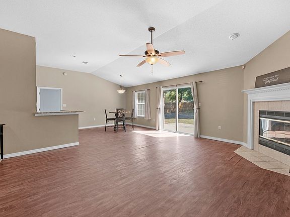 The home features hardwood and tile flooring throughout, a spacious living area with a cozy fireplace, and a VIVINT security system for added peace of mind. The open floor plan allows for effortless flow between living, dining, and kitchen areasideal for everyday living and entertaining.