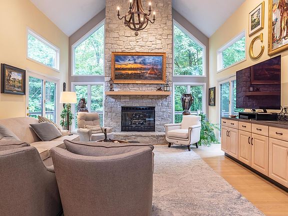 This beautiful, well-maintained 1.5 story stone home has a fully-finished, walkout basement with 4.5 acres filled with wildlife. Whether you're looking for formal or casual or somewhere in between, this lovely house has a variety of rooms to fit anyone's preference. The main level ensuite has a fireplace, huge walk-in closet, sitting space and spacious bathroom with standup, tile shower and soaking tub. The light-filled family room with high ceilings brings nature indoors. The equipped kitchen with island makes a perfect space for entertaining. The upper level loft is a great space for quiet or study time. Each upper bedroom has a private bathroom and there is a huge bonus room that would be great for a gym, home office, hobby or recreation. The lower level has a spectacular 14x7 wine cellar, a kitchenette bar, a full bath, and a design to accommodate plenty of activities. There is also a great workshop and plenty of storage space. The house has two HVACs and a whole house generator for a peace of mind.