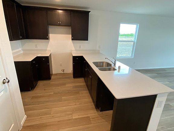 The highly coveted floor plan has an open concept kitchen with an island for storing cooking gadgets, plenty of modern light gray cabinetry and quartz counter top space with a light gray subway tile backsplash and coordinated gray, brown light Rigid Core Polymer plank flooring throughout the entire home. Plush stain resistant carpet in all bedrooms. The kitchen is open to the family room located near the breakfast nook and covered patio for entertaining or relaxing at home with family. Double vanity with quartz countertops in the owner's suite bath and enlarged shower with linen closet.