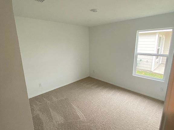 Modern light gray cabinetryPlush stain resistant carpetQuartz counter topCovered patioSubway tile backsplashLinen closetOpen concept kitchen