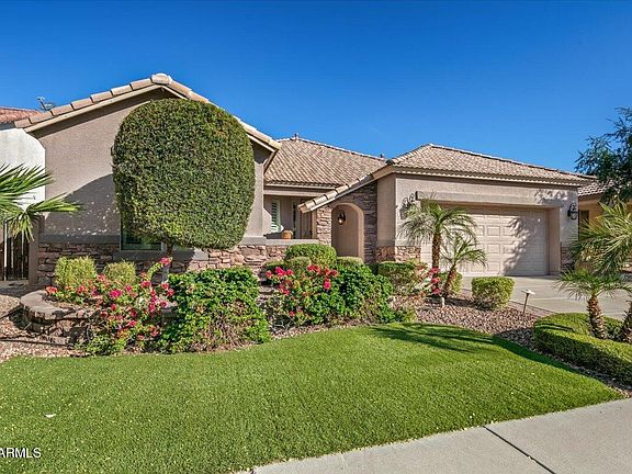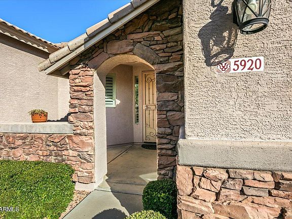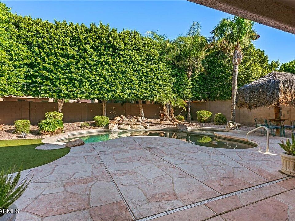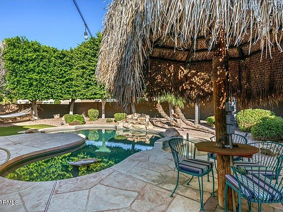 Enjoy luxury living every day in this 3-bedroom, 2-bath single-level home located in the exclusive gated community of Mission Ranch. Nestled against the mountains close to Thunderbird Preserve hiking trails, this home offers the perfect blend of comfort, privacy, and style. The open- concept layout features a gourmet kitchen with upgraded cabinets, breakfast bar, and elegant finishes that flow seamlessly into the family room with a stacked stone fireplace. Thoughtful upgrades include plantation shutters, fresh paint, new carpet, and a remodeled master bath. Step outside to your private backyard oasis with a waterfall, pool, heated spa, built-in BBQ, custom tiki hut, extended patio, and lush grassy area—perfect for entertaining year-round. Additional Features: paver driveway extension, RV gate, and proximity to shopping, dining, and top-rated schools.