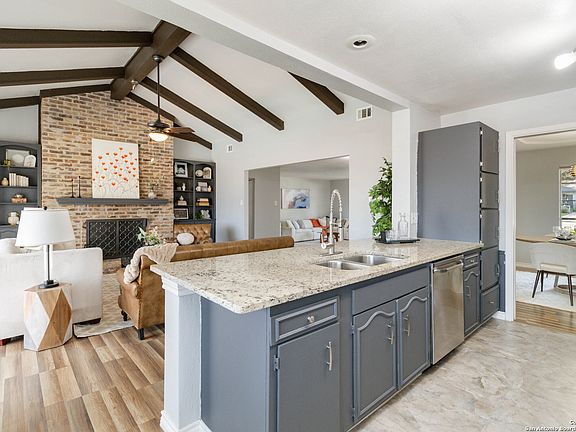 Welcome home in Windcrest! Back on market with a brand new roof. Tucked away in a charming and established mid century neighborhood away from busy streets, this 4 bedroom, 3 bath home is the perfect place to call your own. 3 spacious living areas connect with an open kitchen and breakfast nook with lovely views of the backyard and pool. Living room has vaulted ceilings with exposed wood beams, with a stone fireplace and built in shelving. A triple wide sliding door and well placed windows offer lots of natural lighting. The primary suite has French doors opening up to the pool and patio. Updated throughout, featuring charming built ins and practical storage options. Fenced in backyard offers both privacy and views and is great for all seasons with an in ground pool and a fire pit! Close to restaurants, shopping and the city park. Move in just in time for the Windcrest light up, a magical holiday lights display. Don't miss the chance to make this home your own.