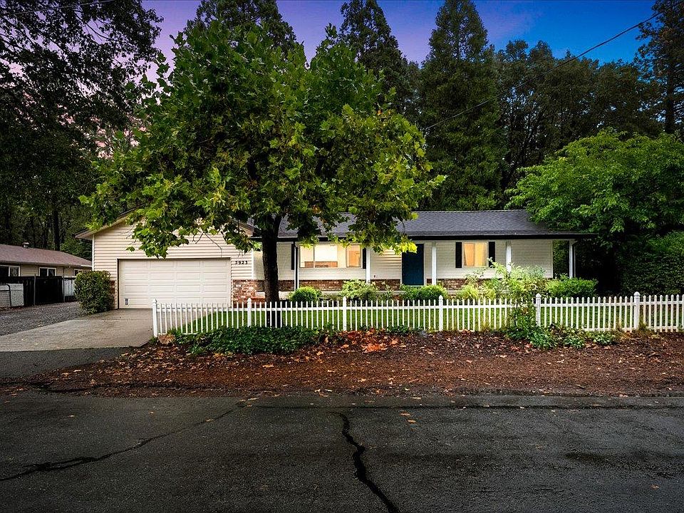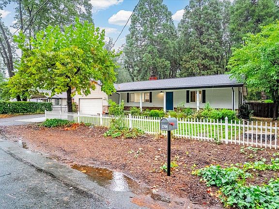 A charming remodeled home nestled within the trees of Foresthill. This property has a classic white picket fence, black window shutters, brick accents and a covered porch that immediately welcomes you. Imagine living in this clean and move-in-ready retreat. The home features luxurious LVP flooring for durability and easy maintenance. The heart of this home is the inviting living room complete with a brick fireplace and the updated kitchen. The kitchen features timeless granite counters, shaker style cabinetry, chic lighting, and fixtures. On one side of the home is the primary suite with a custom tile shower, outside access and the convenience of an indoor laundry area. The other 2 bedrooms sit on the other side of the home. In 2023 new ductless units were installed in each room for heat and A/C and the roof and gutters were replaced. The practicality extends outside with a 2 car garage PLUS a 600 sqft detached metal shop ideal for hobbies or additional storage. Plus, with room for your RV or boat, your adventure gear will always have a home. This property is more than just a space; it's a place where you can begin your homeownership journey surrounded by nature and modern amenities.