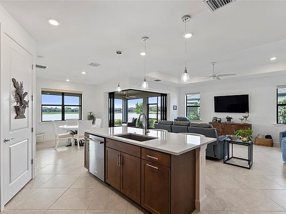 STUNNING WATER VIEW | BUILT IN 2023 | MOVE-IN READY! Enjoy resort-style living in this beautifully upgraded MYSTIQUE floor plan home, situated on a large lot in the highly desirable 55+ Del Webb Naples community. This home features 3-bedroom + den. The GOURMET KITCHEN features custom cabinetry, upgraded appliances, a stylish backsplash, and an expansive island perfect for entertaining. The open-concept living area flows seamlessly to the EXTENDED COVERED LANAI, showcasing ZERO-CORNER POCKET SLIDERS, ELECTRIC HURRICANE SCREENS, and accordion shutters - perfect for relaxing or hosting guests while taking in the tranquil water views. Retreat to the PRIMARY SUITE, complete with dual sinks, a large shower, and a generous walk-in closet. The versatile flex room is ideal for a home office, guest room, or creative space. Additional highlights include designer lighting, custom window treatments, TILE FLOORING THROUGHOUT, and a UV light system for the A/C. The GARAGE offers a 4-foot extension, custom flooring, and overhead storage racks. The laundry room is equipped with built-in cabinetry for added convenience. With FURNISHINGS NEGOTIABLE, this home is ready for you to move right in. This home comes with the SOCIAL MEMBERSHIP, but take note GOLF LOVERS, Panther Run Golf Club offers optional MEMBERSHIPS with premium golf experiences just steps from your backyard. In Del Webb Naples, you’ll enjoy WORLD-CLASS AMENITIES that rival luxury resorts: dine at the Rusty Putter Restaurant, soak in the RESORT-STYLE or LAP POOLS, break a sweat in the state-of-the-art FITNESS CENTER, and play your way through PICKLEBALL, TENNIS, bocce, billiards - even a top-tier GOLF SIMULATOR! Need groceries, church, or a bite to eat? Just hop in your golf cart and cruise into town - Publix and the heart of Ave Maria are just minutes away. This isn’t just a home - it’s a LIFESTYLE UPGRADE in one of Southwest Florida’s most vibrant 55+ communities. Don’t miss your chance to live where fun, fitness, and friendships flourish year-round!