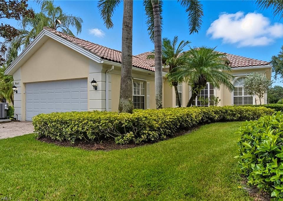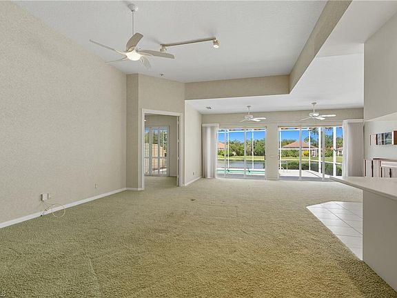 Enjoy beautiful sunsets in this lake front home in the desirable Island Walk community! This spacious 3 bedroom plus den home is the elegant Oakmont floorplan, with the rarely available extended living area (an additional 200 sq ft under air). Open concept kitchen, dining and living area, with wall to wall sliders to the screened lanai and pool. Spacious primary suite with amazing closets, en suite bath and private entry to the lanai. The home boasts two very unique teak built-ins which give it a cool mid-century modern vibe! Additional hanging shelf system in the garage, as well as finished flooring in the attic, provides storage space to meet all your needs! New 4-ton Rheem HVAC (2024) and newer HW tank, tiled garage floor, plantation shutters throughout, new pool pump, solar cover, electric awning on lanai, leaf filter system (2022) and hurricane protection complete the package. Residents of Island Walk enjoy a large town center offering many amenities as well as hair & nail salon, post office, gas station, car wash, popular restaurant, fitness center, resort and lap pools, pickleball, tennis, bocce, and a putting green. Conveniently located near beaches and everything Naples has to offer.