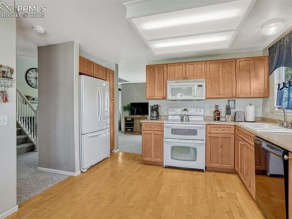 Welcome to your dream home in a friendly cul-de-sac setting! This stunning 3-bedroom, 3-bathroom residence boasts 2,604 sq. ft. of thoughtfully designed living space, making it perfect for a variety of lifestyles. As you approach, you'll notice the exterior of the home just received a facelift of new paint. Allow a charming covered front porch that invites you to relax and enjoy the peaceful surroundings, while snacking on the delightful raspberry bushes around the corner - perfect for a sweet summer treat! Step inside to discover a freshly painted interior adorned with new carpet, creating an inviting atmosphere throughout. The spacious living room features a bay window and vaulted ceilings, flooding the space with natural light. The heart of the home is undoubtedly the expansive kitchen, showcasing beautiful hardwood floors and ample space for dining. You'll appreciate the updated kitchen cabinets that provide extra counter space and pantry storage. The cozy family room, complete with a gas fireplace and built-ins, serves as the ideal gathering space for relaxation and entertainment. The primary suite is large and spacious and the adjoining bath has new hardwood floors plus a walk in closet. The backyard is fully fence, has a large storage shed and is a blank canvas ready for your personal touch. Convenience is key, with nearby parks, grocery stores, and schools just a short walk away. Located within close proximity to Peterson, Schriever, and Fort Carson, this unique Keystone model from Melody Homes offers an exceptional opportunity to live comfortably in a vibrant community.