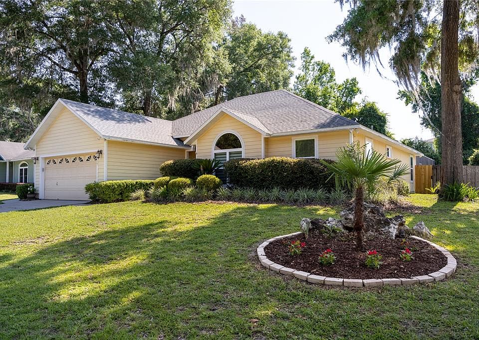 This gorgeous custom home sits on a large corner lot and backs up to a nature trail with a NEW roof (2022) and NEW AC (2023). As you enter you'll feel welcome and invited to enjoy the comfort and beauty of this home. The great room opens up to a sparkling pool with screen enclosure that will encourage you to relax and enjoy. Go for a swim or head out onto the lawn to garden as your fenced in back yard has space for both. The kitchen comes complete with newly painted cabinets, granite counter tops, canned lighting, deep under mount sink, stainless steel appliances and newer (2019) stainless-steel refrigerator. Enjoy your meals in the dining area off the kitchen with amazing natural light coming through the double insulated Pella windows (2019). Guest bath was completely updated in 2017 and has double sinks. Master Suite offers a garden tub, shower and walk-in closets. Laundry room off of the garage has utiliy sink and a W/D that stay with the house. Hickory Forest offers a community pool, clubhouse, tennis courts and playground. Low HOA of $185 every 6 months and also has sidewalkes throught the subdivision. Zoned for Wiles, Kanapaha and Buchholz. Just minutes from Shands, UF, NFRMC and I-75,