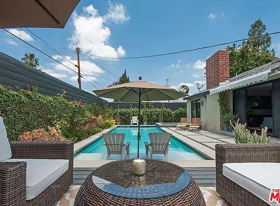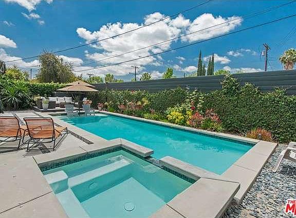 Remodeled, Mid Century Modern Encino Village home features an impressive salt water pool w/ Cabo Ledge+cascading spa, stylish Cabana & new drought tolerant pebble hardscape-ideal for entertaining & enjoying year round! Gated front entry allows for privacy & an enclosed, front courtyard. The home has an inviting, open layout w/ lots of natural light. 2015 remodeled kitchen w/ Quartzite Countertops, subway tile backsplash, stainless appliances, farmhouse sink, ceramic tile floor & reverse osmosis water filtration. 4 generously sized bedrooms, remodeled bathroom w/ natural stone tile floor, new subway tiled shower+tub & new vanity. Tankless water heater, real hardwood floors throughout and spacious living room w/ fireplace looking onto the backyard oasis. Surround sound installed in living room, dining area & backyard. Expansive front lawn. Large 2 car garage. This mid century modern gem is located on a tree-lined street close to parks, shops, eateries & Encino Charter Elementary School.