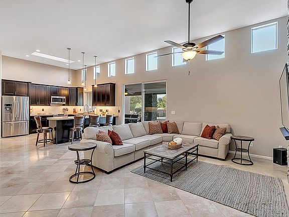 Beautifully updated home in 2014 - 2015. Over an acre of land w/mountain views. 1st floor master. Updates: Kitchen, Owner's Suite Bath, 2ndary bathrooms, Great Room & upstairs Bonus/Media Room w/wet bar. Attention to detail quite remarkable. Travertine flooring. Must see home. Owner's suite has stand alone Miele tub, oversized shower and a custom closet with more space behind the mirrored cabinets. There is a formal dining room, great room as well as 3 other bedrooms & 2 full baths. Heated negative edge pool & spa, a water feature & a gas fire pit. Very private. View deck as well, but you can see the mountains from below. Large 3 car garage. Cement pad below could be a sport court. Entry courtyard with Fountain. Exterior of the home was painted in 2021.
