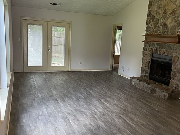 Stacked stone fireplaceVaulted ceilingsFresh paintClean flooring