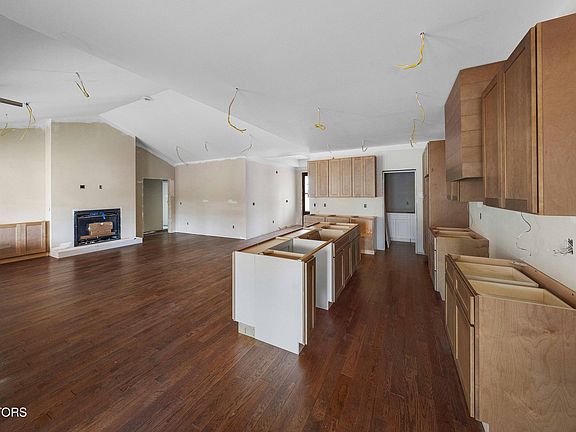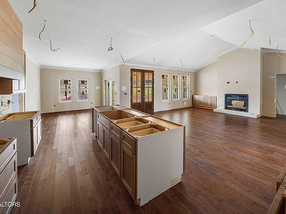The open layout features vaulted ceilings, hardwood floors, and a seamless flow between the kitchen, dining, and living areas—ideal for entertaining or quiet evenings at home. The chef's kitchen showcases warm wood cabinetry, brushed gold accents, a custom wood hood, and cabinets built inside the walk-in pantry for thoughtful organization.