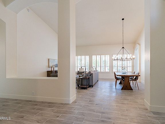 This inviting residence features a stunning open main area, highlighted by new wood-look tile flooring, the vaulted ceilings & large windows create an airy & bright atmosphere. The kitchen has been updated with sleek quartz countertops, stylish wood shaker cabinetry, & stainless steel appliances. All four bedrooms are adorned w/ new, plush carpeting. The primary suite is a standout feature of the home, offering a spacious walk-in closet & an ensuite bathroom, complete wi/ a chic free-standing soaker tub & separate walk-in tile shower. Outside, the expansive covered patio is perfect for enjoying outdoor meals & gatherings, all while overlooking a pristine pool. The home also includes a generous 3-car garage, providing ample space for vehicles & additional storage.