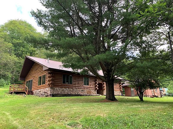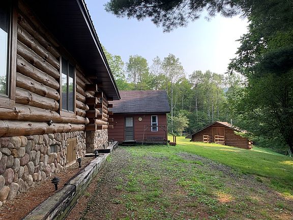 Large secluded log home on 94.74 acres of woods! Walk through the big log entrance into your living room with a vaulted ceiling with a Quadra Fire wood stove to take the chill off. A separate dining room also has a vaulted ceiling and a huge sliding glass door opening onto the side deck, Nice sized eat in kitchen with an island give plenty of workspace. Separate laundry room and office space with its own outside entrance or possibly convert to 3rd bedroom? Main home has 2- baths and 2 large bedrooms but plenty of additional sleeping space available in the cottage house next door with it's own 3/4 bath. There is a large log detached 2 car garage with 200 amp service , including workshop w/ plenty of room for all your toys! The garage has a 2nd floor w/ 7' ceilings that could easily be finished off for additional living space. This peaceful property includes a stream and small pond. Would make a great hunting retreat or rent out the cottage as an Air BnB. Look no further, call today.