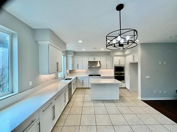 The second level features a spacious and luminous open-concept living space, comprising a family room, dining area, and kitchen. The kitchen is equipped with beautiful white cabinetry and a striking center island, while stainless-steel appliances, such as a microwave, oven, and range, complete the modern look.