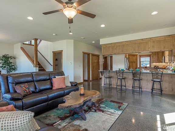 Custom built w/unbelievable 250 ft waterfront/view on flat 1.7 acres. Recent renovation includes complete interior paint, re-finishing all cement floors, new polished cement counters in all bathrooms and utility room, new finishing touches everywhere....even brand new washer/dryer. Completely open great room on main floor for your enjoyment of lake. Huge partially covered patio on main level & covered deck off family room on upper level. Fully renovated shop for your DIY projects. Much more!