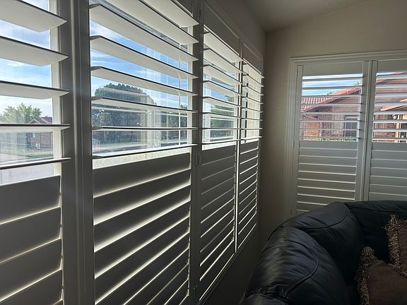 Bright, open layout with large windows, wood shutters, and blinds for privacy