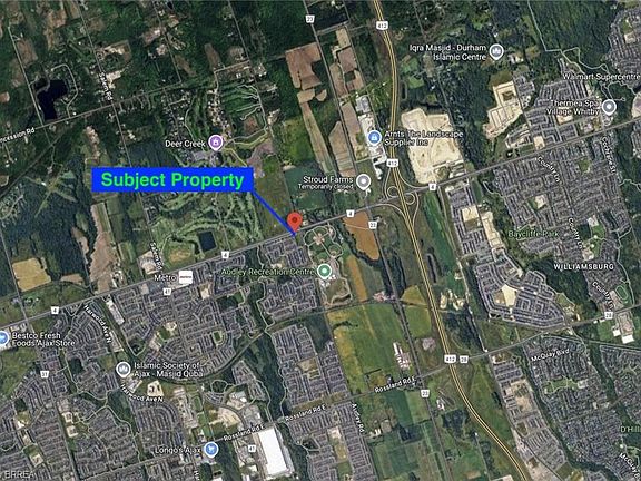 Great opportunity to purchase a 2.3 acre development parcel with zoning in place allowing for 88 stacked townhouse units and 8 traditional row townhomes. Located in the southwest corner of Taunton Rd E & Audley Rd. Prime Ajax location, close proximity to Highways 412, 401 and 407. Easy access to transit, near Deer Creek Golf Course, rec center, great local area amenities and huge residential development nearby. Property sold under Power of Sale on an 'as is, where is' basis, land value only. Comprehensive deliverable package available with signed confidentiality agreement.
