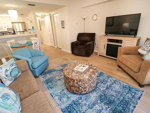 The master bedroom offers a king-sized Tempur-Pedic mattress, a 40" LED Smart TV, and a DVD player. The guest bedroom includes one full bed and one twin bed, while the living room features a sleeper sofa, a 50" LED Smart TV, and another DVD player perfect for relaxing after a day in the sun. A washer and dryer are conveniently located in the unit.