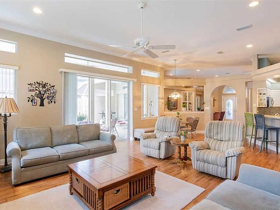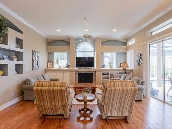 Executive style POOL home centrally located in-The Reserve at Carpenter's Creek. No detail has been overlooked in this pristine, move in ready beauty. The manicured lawn, mature landscaping and welcoming, covered front porch are just the beginning of all this home has to offer. Entering the leaded glass front door, you are greeted by soaring 12ft. ceilings, beautiful crown molding and gorgeous wood look, tile plank flooring that runs throughout the main living areas. The great room is open & spacious with stunning built-in cabinetry, a gas fireplace, unique niches and a triple slider leading to the lanai and over looking the sparkling, screened in, gunite swimming pool. A formal living room adds an additional living area and overlooks the pool with and additional slider leading to the lanai. A quaint breakfast nook is adjacent to the kitchen which is a chefs dream and offers quartz counters, tile back splash, stainless appliances, an abundance of cabinetry and a breakfast bar. For more formal dining, there is also beautiful dining room perfect for family dinners or intimate dinner parties. The split bedroom floor plan offers plenty of privacy for the master suite which includes a large bedroom with plant ledges, tons of windows and a triple slider leading to the lanai. The master bath is HUGE and features his & her closets, a step up, jetted garden tub, large walk-in, tiled shower, and double vanities with a built-in seating area. The 3 additional bedrooms are all over sized with carpeted flooring and spacious closets. 2 of these bedrooms are connected by a Jack -n- Jill bath with double vanities and a tub/shower combo. The additional full bath has a walk-in shower as well as an exterior door to the backyard. For the outdoor lovers, the screened in pool offers a great space for entertaining and overlooks a large manicured backyard. The extra touches and well thought out design of this home extends from top to bottom and pride of ownership shows throughout!