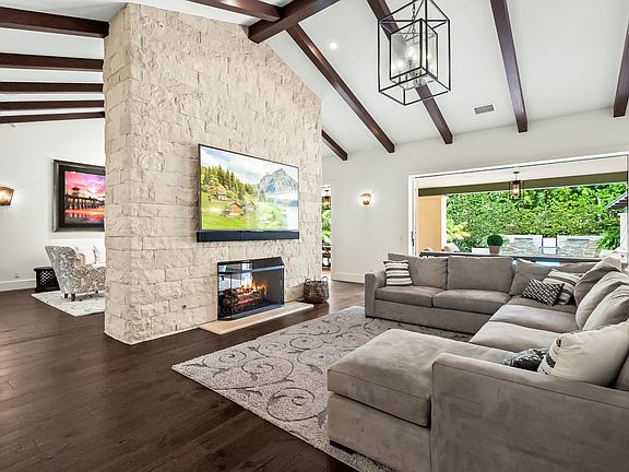 Set on an exceptionally private 0.52-acre gated parcel, this furnished estate offers nearly 5,800 sq ft of meticulously designed living space plus two separate 2-car garages and generous off-street parking. The residence features 6 ensuite bedrooms, each with a walk-in closet, along with a powder room and hardwood flooring throughout. The living and family rooms share a dramatic floor-to-ceiling dual-sided fireplace and showcase vaulted beamed ceilings and disappearing doors that open to expansive covered outdoor areas. The chef's kitchen includes quartzite countertops, a large island with bar seating, stainless appliances, and a butler's pantry. The entire upper level is devoted to the primary retreat, offering an office/loft flex space, two sets of French doors to a large covered deck, an oversized walk-in closet, and a spa-inspired bath with dual vanities, a soaking tub, and a spacious shower. Designed for exceptional outdoor living, the backyard features tall privacy hedges, a pool and spa with a water feature, a large grassy area, and an impressive outdoor pavilion with a full kitchen, bar seating, wine fridge, pizza oven, fireplace, and smoker. Additional amenities include a new outdoor half bath, sauna, cold plunge, and outdoor shower. The perfect blend of privacy, comfort, and thoughtful luxury.