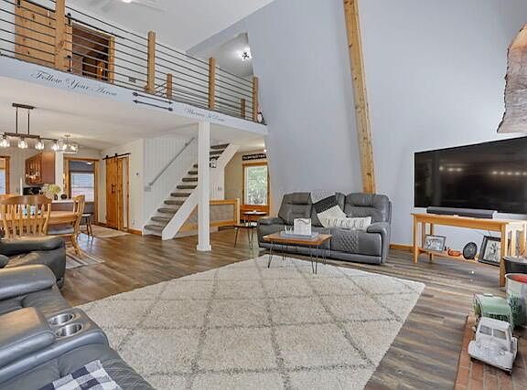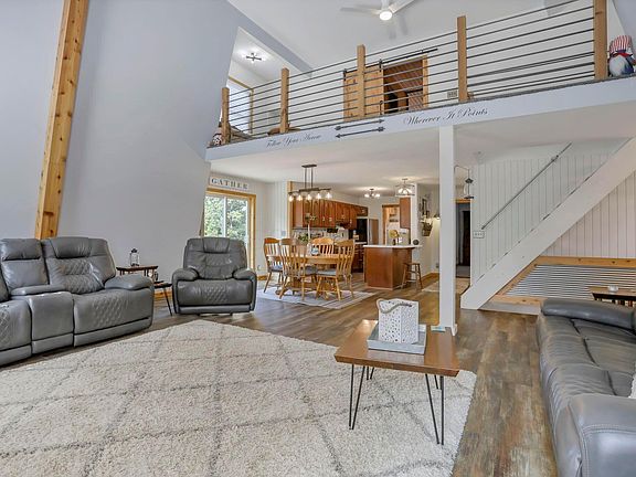 Spacious modified ''A'' frame 3 bed, 3 bath home on 10 acres + or - TBD. Additional acreage can be purchased. This home has cathedral ceilings and fireplace in the great room. Enjoy cooking in a kitchen with solid surface countertops and Schrock cabinets. The finished walk-out basement adds extra living space, while multi-tiered decks and a patio with a fire pit create the perfect outdoor entertainment area. Recent updates include a roof, heat pump, and finished basement. The detached 3-car garage/barn provides ample storage. Nestled in a park-like wooded setting, this convenient location offers both privacy and charm—your perfect retreat!