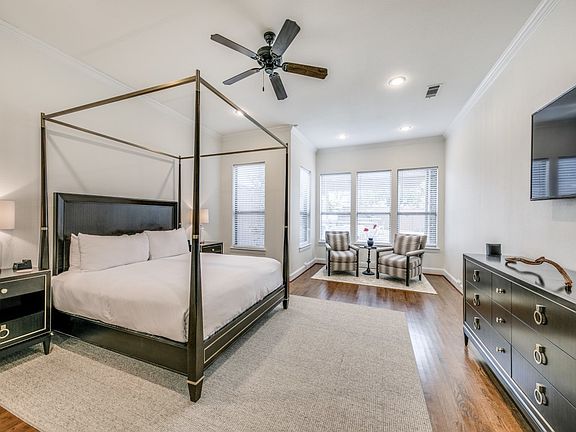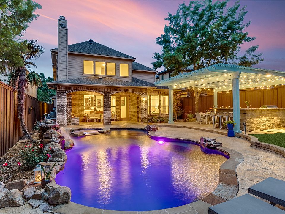 This is the description: Stunning home with a resort-style outdoor entertaining area, featuring a heated pool and spa, outdoor kitchen, covered patio with a fireplace, and a spacious grassy yard. The downstairs study, accessed through French doors, offers privacy and style. The open-concept living and kitchen area seamlessly overlooks the outdoor living space. The kitchen boasts a large island, granite countertops, stainless steel appliances, custom cabinetry, and a breakfast bar. The expansive master suite includes a sitting area and a luxurious bathroom with travertine flooring, a jetted tub, oversized frameless glass shower, double vanities, and an enormous walk-in closet. Upstairs, you'll find three additional bedrooms, plus a bonus room that could serve as a media or game room. Gorgeous hardwood floors flow throughout the home. Ideally located near Lakewood, Lower Greenville, White Rock Lake, and downtown!