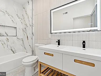 Designer Bathrooms: Indulge in spa like comfort with modern, wide white vanities, sleek black plumbing fixtures, and gorgeous floor to ceiling marble look tile. The backlit, anti fog mirrors add a touch of high end luxury.