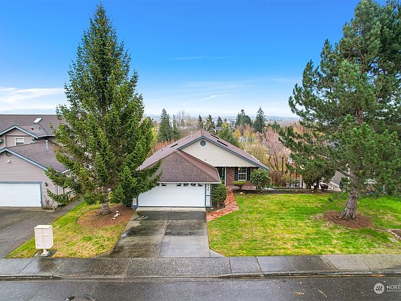 Custom-designed home featuring stunning pond & Mt. Baker views. Enjoy a one-level living design w/ spacious living room, vaulted ceilings & built-in storage. Skylights & large southern-facing windows bathe the interior in natural light. Two main-level suites w/ adjoining baths, including a massive walk-in closet & dedicated office space. The large partially finished basement provides versatile living options with separate access, ideal for multigenerational living or as a future income producing rental space. Each floor features expansive decks for relaxation. Updates include siding/paint, newer furnace, and a whole-house dehumidifier. Nestled in a tranquil neighborhood with walkable trails and conveniently close to the new High School.