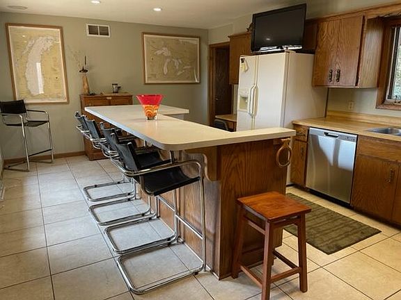 Peace and Serenity as you follow the circle drive onto this true Waterfront sanctuary. Bring your paddleboats and fishing gear. Get the OUTDOORS feeling with the Maple flooring and Pine vaulted ceilings in this walkout style ranch home. 4 beds, 3 full remodeled baths. Brand new dishwasher, microwave, newer furnace, ac, mission style solid doors, newer well pump and whole house Generator to name a few. 2 full masonry natural fireplaces. 2 Huge Rec-Room areas. Sliding doors lead out to Fire pit, deck, patio to enjoy for all seasons while enjoying Mother Nature at her finest. Heated garage. First floor laundry can easily be added with plumbing in place in back hall.