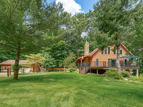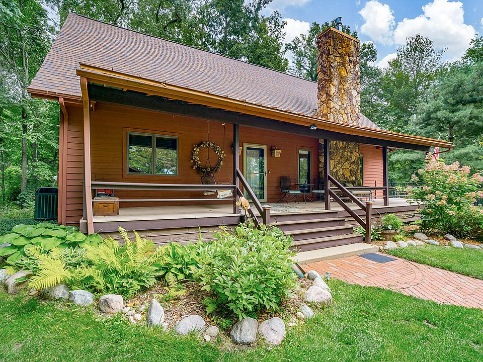 Welcome to this absolutely beautiful home nestled on a very private wooded lot that sits off the road giving it that ''Up North'' feel. The large covered front porch wraps around the home where you can sit and enjoy your beautifully landscaped yard and sunsets over the vineyard. Inside you are greeted with an open floor plan that is perfect for entertaining and enjoying the spectacular 23-foot vaulted ceiling that is accented by multiple windows bringing in the sunlight, nature and includes real hardwood floors. The open concept kitchen includes stainless steel appliances, granite countertops and an island with additional counter/dining space. The flexible dining area is a bonus when in need of a larger space for dining/gathering. Two sizable bedrooms and a full bathroom complete the main level. The primary en-suite is located on the second level giving privacy and includes a functional loft space that overlooks the main living area. Another nearly 900 finished square feet on the lower walkout level includes a room with a closet, two separate recreation areas, a half-bathroom, laundry/storage area and the mechanical room. Outside there is a 24x32 garage, two storage sheds (12x20 and 10x16) and a fenced in area with endless opportunities. All of this is located minutes from the highway and Texas Corners, which continues to be one of the most sought-after communities and in the award-winning Mattawan School District.