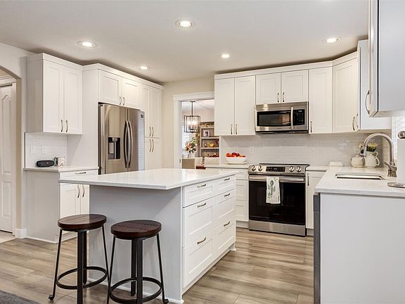 Bright kitchen with islandSunny eating nookNatural gas fireplaceSpacious primary suiteWalk-in closetFully fenced backyardGrape vines