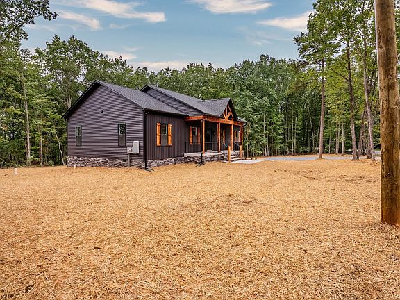 Discover modern comfort in this beautifully crafted 3-bedroom, 2-bathroom home on a private wooded lot at 594 Community Road, Dillwyn, VA. Built by one of Buckingham's most meticulous contractors whose houses are sought after now and for years to come, this brand-new construction features striking dark siding with natural stone accents and warm cedar shutters. Inside, enjoy open-concept living with luxury vinyl plank floors, a designer kitchen with white cabinetry, quartz counters, stainless appliances, and spacious island. The dramatic covered front porch showcases exposed timber framing, while the rear deck and gravel driveway complete this move-in ready retreat. Perfect blend of contemporary design and rustic charm in a tranquil setting surrounded by mature trees. Centrally located to Charlottesville, Appomattox, Lynchburg, and Amherst County.