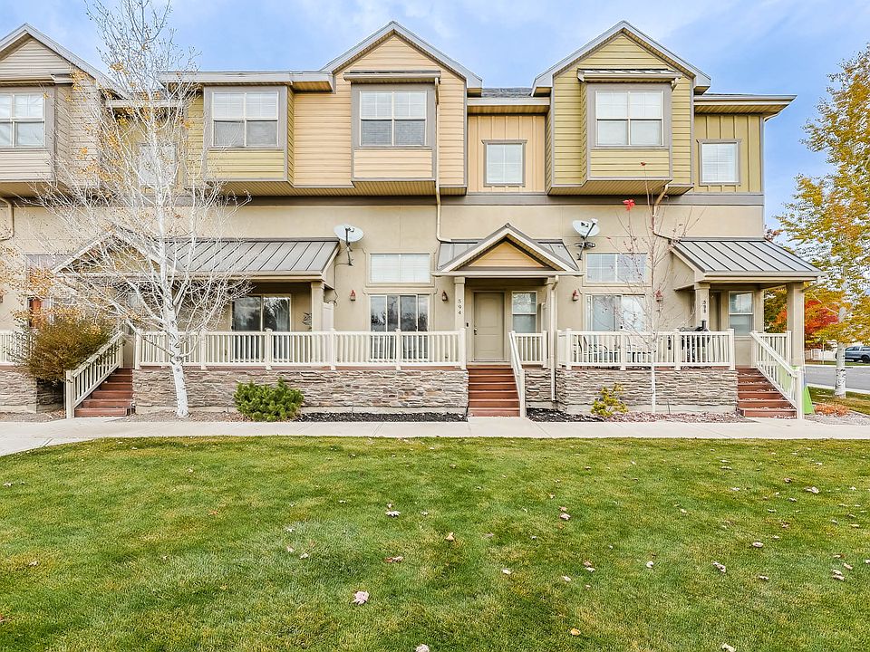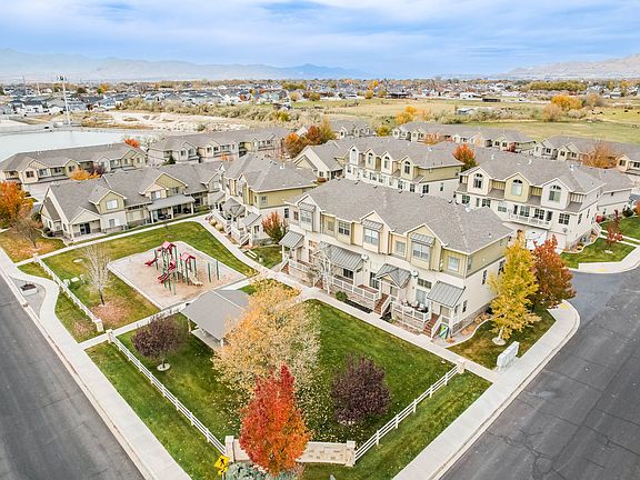 Discover a rare gem in the highly sought-after Spring Creek Ranch lakeside community in Lehi. This beautifully designed townhome offers bright, open living spaces and a warm, inviting atmosphere throughout. The main level is perfect for entertaining or relaxing, featuring a spacious living area with soaring ceilings and direct access to a charming front deck overlooking the shared green space, picnic area, and playground. Upstairs, the stylish kitchen boasts generous cabinetry, granite countertops, and an adjoining dining area. A versatile den or home office, convenient half bath, and an additional balcony complete this level, offering both functionality and comfort. The top floor features two spacious bedrooms, each with its own full bathroom, along with a conveniently located laundry room. The attached two-car garage provides security for your vehicles and easy access to additional storage space beneath the home. The Spring Creek Ranch HOA truly stands out, offering three beautiful parks, a private pickleball court, and a network of scenic trails that wind through protected wetlands-perfect for those moments when you just want to step outside and connect with nature. And that's only the beginning! Enjoy peace and privacy in this quiet community while remaining close to everything - excellent schools, shopping, dining, and quick access to I-15. This townhome perfectly blends comfort, style, and convenience in one exceptional package.