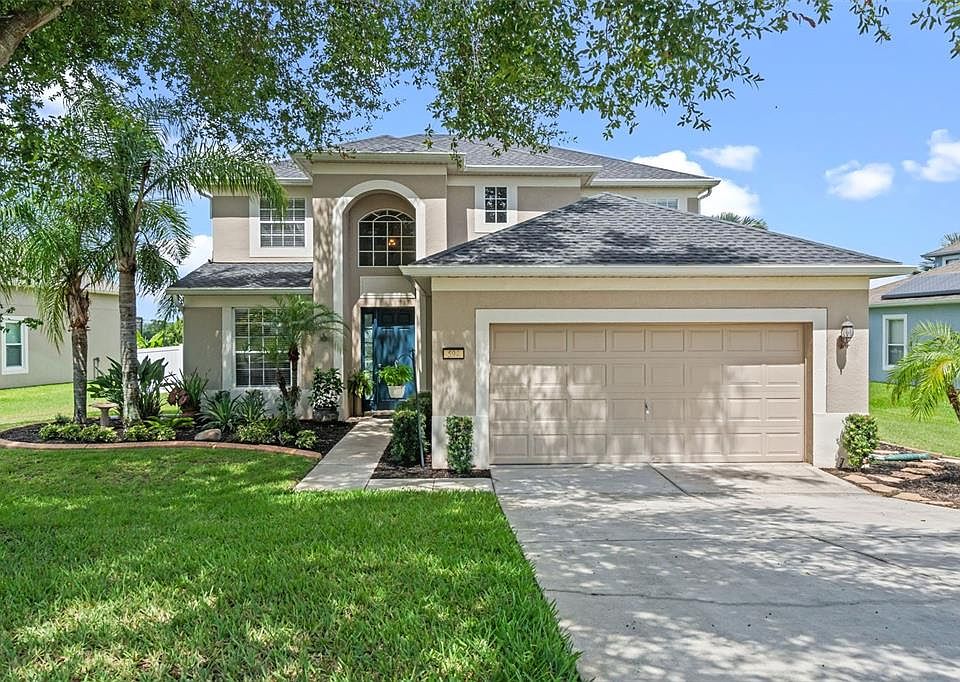 Welcome to this stunning 5-bedroom, 3.5-bathroom home located in the highly desirable Verde Ridge community. Nestled beneath shady trees on an expansive lot, this property offers a peaceful setting with plenty of curb appeal, thanks to its beautifully maintained front garden and welcoming exterior. The oversized two-car garage and spacious driveway provide ample parking for residents and guests alike. Step inside and be captivated by soaring ceilings and luxury vinyl plank flooring that flows seamlessly throughout the main living areas. A formal dining room greets you at the front of the home—an ideal space for hosting holiday gatherings or elegant dinner parties with Primary bedroom located downstairs.. Just beyond, the open-concept living room is bathed in natural light from wall-to-wall sliding doors that lead out to your private lanai, creating a seamless indoor-outdoor living experience. The gourmet kitchen is a dream for any home chef, featuring rich wooden cabinetry, sleek stainless steel appliances, granite countertops, and a massive center island, where you can enjoy your morning coffee or entertain friends. A secondary dining area overlooks the lanai and adds flexibility for casual meals. The primary suite is conveniently located on the first floor, offering a private retreat with its own lanai access. The luxurious en-suite bathroom boasts dual vanities, a large walk-in shower, a soaking tub, and an impressive walk-in closet designed to keep everything organized. Upstairs, a spacious loft leads to a bonus game room—perfect for ping pong, a home theater, or a pool table. Four additional bedrooms and two full bathrooms are also located on the second level, providing comfortable accommodations for family, guests, hobbies, or a home office. Step outside to your fully fenced backyard oasis, where you can garden, grill, or simply enjoy the peaceful lake and conservation views. There’s plenty of room for pets or playtime, making this a magical space to unwind and connect with nature. Upgrades to mention include a brand new roof in 2023 and HVAC unit was replaced in 2020. This rare gem offers room for everyone and every lifestyle, all in a prime location close to shopping, dining, and top-rated schools. Residents of the Verde Ridge community enjoy access to top-notch amenities, including a picturesque park, peaceful walking trails, and a refreshing resort-style pool. Don’t miss your opportunity to make it yours. Call today to schedule your private showing before it’s gone!