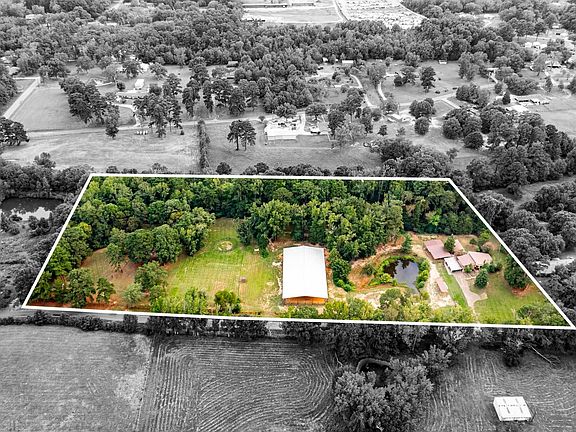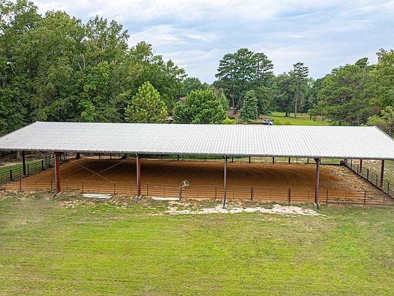 HORSE AND LAND PARADISE! Bring your horses and start riding, rain or shine, day or night, in your very own 80’ x 150’, fenced, brightly-lit, Priefert-built, covered arena! You can also enjoy watching your horses stay cool in the pond from the balcony of this unique, 2693-square-foot, three-bedroom, two-bathroom home nestled in the piney woods of East Texas on 7.9 acres. Conveniently located minutes from Longview and Hallsville in the highly sought-after Hallsville ISD, this property is perfect for a small training operation, equine therapy practice, hobby farm, or a busy rider needing a place to practice any time despite weather and/or work hours. A charming, finished 12' x 20' building overlooking the arena makes a perfect office, and horses love roaming and grazing the wood-and-Electrobraid-fenced pastures and taking shaded naps under the majestic trees. Store your tack right by the arena in the cedar-lined tack shed, and top off a great arena ride with a cool-down on the wooded bridle path behind the creek. Horses can get cozy in the rustic 32’ x 58’ pole barn with 5½ stalls and an open-air design including multiple fans, and a 10’ x 58’ loafing porch. Property also features a wash rack, a 36’ x 12’ loafing shed, two round pens, an additional 5’ x 8’ enclosed storage shed, 12’ x 24’ open equipment shed, and a shop building directly behind the house. The attached carport can hold up to four cars, and a nice-sized, fully fenced back yard is ready for your dogs! After a chilly winter ride, you can cozy up to the beautiful stone fireplace in the home, and in the summers, the heat pump keeps the house nice and cool without breaking the bank. Welcome home!