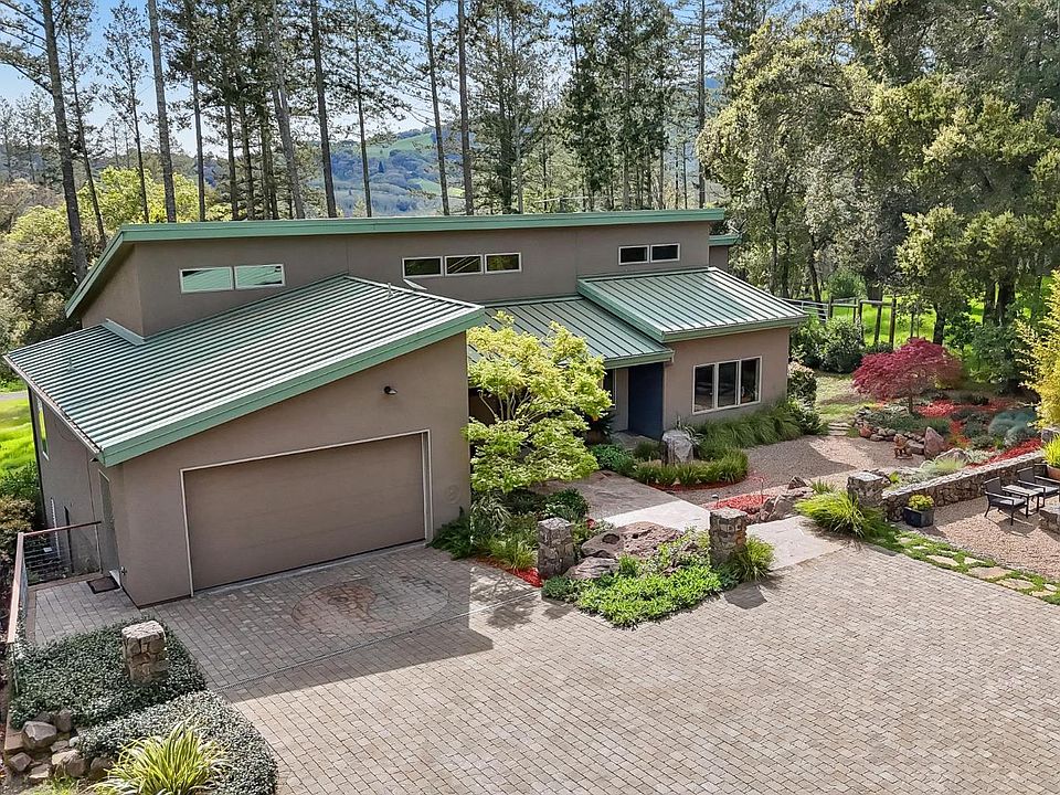 On a serene 1.8-acre parcel in the gorgeous hills above Santa Rosa rests this modern home with detached shop only 10 minutes from town! Quality of construction is felt throughout! With an abundance of natural light, this open & spacious home features 2 primary bedroom suites and an office with view of the wonderful garden. This home is solid and fire-resilient, featuring a metal roof, steel trusses, soaring ceilings and clerestories from which the light just pours in. The gourmet chef's kitchen is a culinary haven, featuring butcher block & stainless countertops and a 5-burner Wolf stove. The living room opens up to the spacious deck with gorgeous views of the surrounding hills and trees. Rich bamboo flooring and radiant floor heating throughout add a touch of warmth and elegance. Also featured are a circulating hot water, central vacuum system, and security system. This sunny and private lot has a huge beautifully paved driveway behind an automatic gate. Wonderfully landscaped garden with spacious seating area, outdoor firepit, and soothing water feature. A 748 sqft detached shop with loft are ready for any of your hobbies. Nestled in the heart of Wine Country, this home offers the serenity of the countryside while being just 10 minutes from shopping, dining, and conveniences.