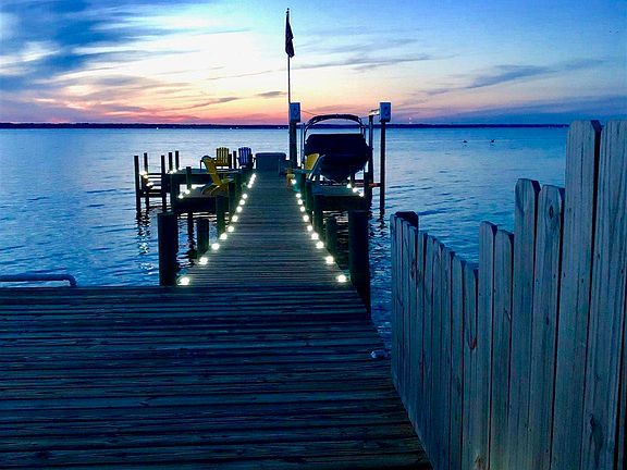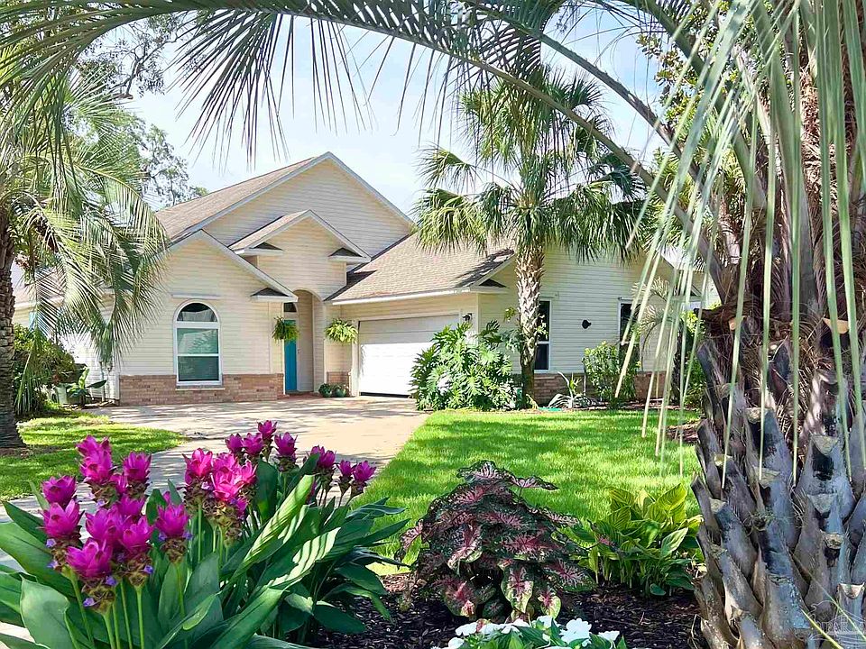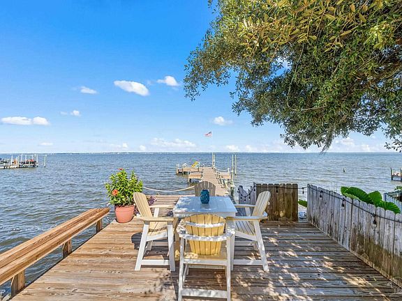 Experience breathtaking, expansive views of Perdido Bay and stunning sunsets from this 3-bedroom, 2-bath waterfront home, perfectly situated at the end of a quiet cul-de-sac just off Innerarity Point Road. Surrounded by mature oaks, magnolias, and graceful palm trees, this home offers convenient walk or bike access to restaurants, live music venues, Publix, CVS, parks, and boat launches. The bright, open living area features vaulted ceilings and is ideal for entertaining while enjoying the serene water views. The renovated kitchen boasts granite countertops, a gas range, stainless steel appliances, a pantry, and a wine cooler. The great room with a cozy fireplace opens to the backyard, complete with a covered patio, Trex all-weather decking, a waterside sitting area, and a pier over the water—pilings ready for a lift or slip. The oversized master suite overlooks the water and includes an exterior door to the covered porch, two walk-in closets, a private water closet, a soaking tub, and a separate walk-in tiled shower with glass door. Two additional bedrooms and a renovated front bath feature a walk-in tiled shower with glass door. An oversized two-car garage provides ample storage for fishing gear, kayaks, and paddleboards. Additional highlights include a sprinkler system, laundry room, rip/rap along the seawall, updated windows, fenced backyard, and the home sits on a generous 1.5 lots in Bay Point Vista Subdivision.