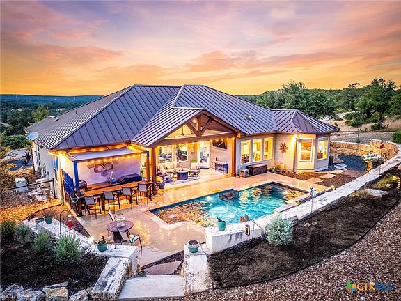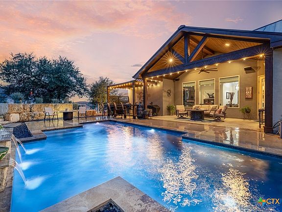Custom home on a 1.6-acre lot within the prestigious guard-gated community of Copper Ridge in New Braunfels. Panoramic Hill Country views right from the comfort of the back porch oasis. Designer finishes throughout the expansive 4-bedroom, 3-bath layout. Granite counters, custom built-ins, spacious walk-in shower, and dual vanities in the owner's suite attest to the quality. Kitchen features an oversized island, upgraded appliances, and a convenient water line plumbed to coffee maker. Upgrades designed to make life both comfortable and carefree include modern lighting and fans, electric fireplace, Generac Generator, extensive backyard landscaping for safety and charm, pergola with shade sail just to name a few. Practical features-such as the resort-style heated pool for year-round relaxation, the workshop off the garage, and a laundry room equipped with a dog washing station and a laundry chute from the owner's closet-have made daily living a true pleasure. Copper Ridge offers amenities for every interest, including a neighborhood pool, sports courts, a playground, and scenic walking trails.