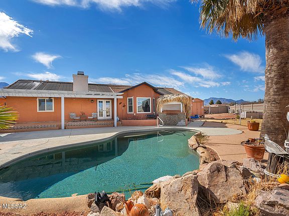 MAJOR PRICE IMPROVEMENT, BUYER OPPORTUNITY! NEW ROOF INSTALLED 3/28/2025! SELLER SAYS SELL NOW! ALL OFFERS CONSIDERED! HOME IN EXCELLENT CONDITION, APPRAISED AT $380,000. 4 Bedroom/2 Bathroom home with a PebbleTec finish Pool, has Privacy at the end of the Lane! and Incredible Views! Privacy wall around backyard and front Courtyard, offering wonderful seclusion. This home has a 2019 permitted Family room, A Large Great Room for all. Recent upgrades include Anderson Windows 2022,Tile and Carpet 2020, Upgraded AC 2018, and RV Gate. Pool has New Filter system and Smart Pump 2023. Beautiful Mountain Views from this home,Home has a Leased Solar system which you can keep with Lease or Seller will Remove, and 3 Sheds backyard, Just minutes from all shopping and amenities in Sierra Vista, WOW!
