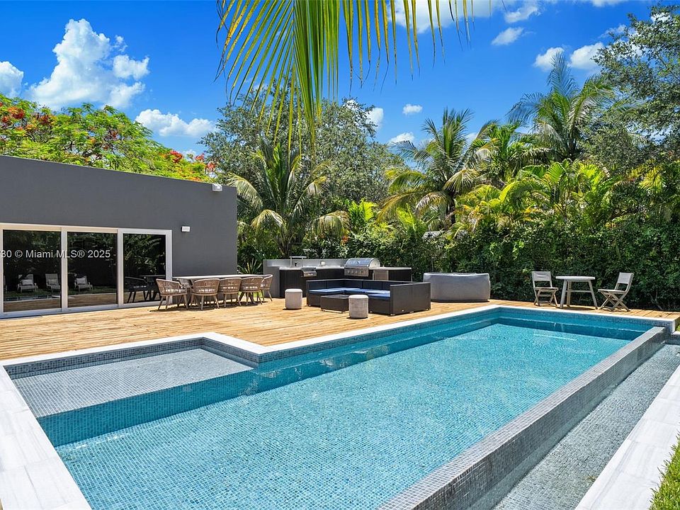 Prepare to be amazed by this 5 BED / 3.5 BATH pool home located in this quiet South Miami neighborhood on an oversized lot! Upon entering you are welcomed by a spacious living room and an open kitchen with cooking island, granite countertops, commercial stainless steel appliances & wooden cabinets boasting generous storage potential. Primary suite features a floor-to-ceiling tile shower. Fully fenced backyard with fruit trees, infinity pool, spa, wood deck and outdoor kitchen is your favorite spot to sip your coffee, sunbathe and enjoy gatherings with friends and family. Home has complete impact protection. Second living room with kitchenette ideal for guests! Solar panels with Tesla Batteries and a large storage container complete the offering. A Beautiful Miami Home! MAKE IT REIN!
